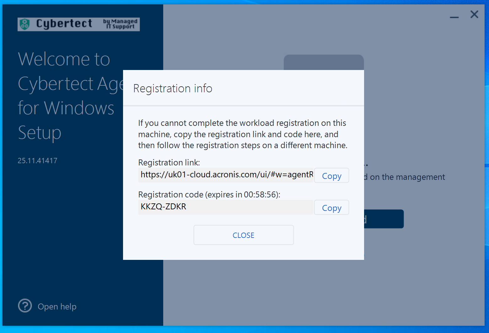 You will see a screen very similar to this, please send your Registration Code to our WhatsApp Channel. You may need to advise who you are and which company you work for if you are not already speaking to our support team. As you can see, there is an hour window for this to be actioned!